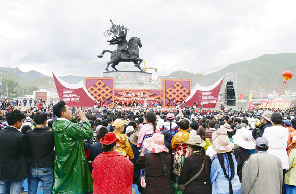 7月15日至16日,中國文聯文藝志愿服務團赴青海玉樹開展“送歡樂、下基層”慰問活動。圖為高聳著格薩爾王塑像的廣場演出現場。中國藝術報記者 郭青劍 攝