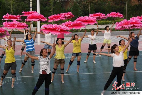 7月29日,山西省陽城縣宇昌煤業有限公司婦女舞蹈隊正在該公司文化活動廣場排練廣場舞。今年以來,山西省陽城縣興起廣場舞熱,越來越多的城鄉居民參加到廣場舞活動之中,每天早晨和晚上在縣城、農村以及企業等文化廣場隨處可見的廣場舞活動成為群眾文化活動的新亮點