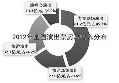 統計顯示,2012年全國演出經紀機構各項收入總計79.1億元,其中劇場售票演出收入48.83億元,企業包場或參與企業年會等活動收入9.83億元,提供中介服務收入3.37億元,藝人代言、廣告等收入約17億元。