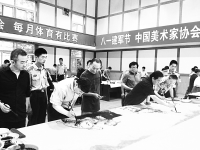正值“八一”建軍節,中國美術家協會今天組織三十多位藝術家前往武警總部慰問,向部隊贈送美術書籍和作品,并觀看了戰士們操練。圖為中國美協分黨組書記吳長江、中國美協秘書長劉健、解放軍美術創作院常務副院長李翔一起合繪大幅畫作。