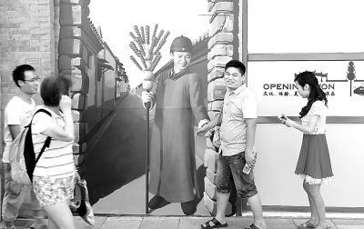 8月8日,游客在北京前門大街上一處3D立體畫前留影。當日,第四屆前門歷史文化節開幕,840米的前門大街上將陸續設置15幅大型立體畫,將前門獨特的文化符號、老字號文化利用現代技術呈現出來。本報記者 郭俊鋒攝