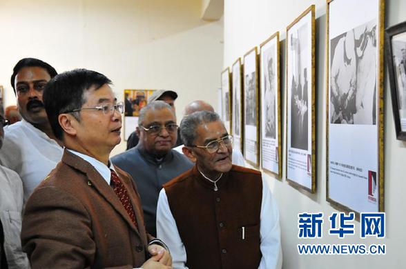 9月1日,在印度班加羅爾,中國駐孟買總領事劉友法(前左)和印度前內閣部長拉賈謝卡蘭參觀圖片展。當日,“新華影廊”紀念柯棣華參加中國抗日戰爭75周年圖片展在印度卡納塔克邦首府班加羅爾開展,集中展示柯棣華生平和各種紀念活動照片,緬懷這位外國友人增進中印交流和友誼的事跡。 新華社記者 趙旭 攝