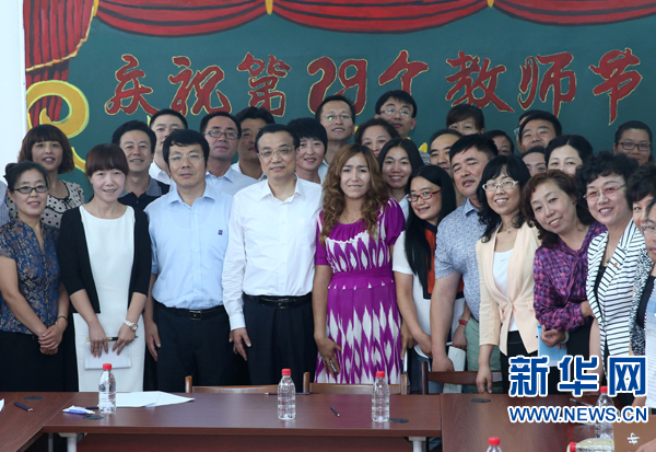 在學(xué)校會議室,李克強同教師代表座談。他說,明天是你們的節(jié)日,我代表黨中央、國務(wù)院向在座各位并向全國的教育工作者致以節(jié)日問候,衷心感謝大家為教育事業(yè)付出的辛勞和心血。曾參加援疆援藏支教、從事新疆班教學(xué)和從貴州、新疆等地來進(jìn)修的老師們爭相發(fā)言,談了體會和感受。援藏的老師還給總理送上一張反映支教生活的光盤,李克強愉快地收下,并表示會好好看。他說,你們懷著一顆熱愛教育的心,為邊遠(yuǎn)貧困地區(qū)孩子帶去知識和希望,匯聚起促進(jìn)教育公平的積極力量。要鼓勵更多人才到西部支教,讓更多西部教師到東部培訓(xùn),這不僅可以提高西部教育水平,更是揚起了一面旗幟,放飛了希望,讓貧困地區(qū)的孩子感到有前途、有奔頭。