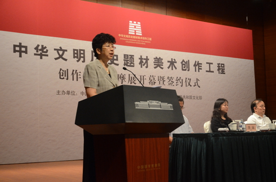 趙實在開幕式上致辭。她說,在剛剛閉幕的全國宣傳思想工作會議上,習近平總書記強調指出,一個沒有歷史記憶的民族是沒有前途的。忘記歷史就意味著背叛。歷史是客觀存在的,歷史是最好的教科書。中華民族在五千多年的文明發展進程中創造了博大精深的中華文化,中華文化積淀著中華民族最深沉的精神追求,包含著中華民族最根本的精神基因,代表著中華民族獨特的精神標示,是中華民族生生不息、發展壯大的豐厚滋養,是中華民族自強不息、團結奮進的重要精神支撐。總書記的重要講話為推動文化強國建設、為繁榮文藝事業、為我們傳承中華文明搞好這項重大歷史題材美術創作工程,進一步指明了前進方向,也提出了新的更高的要求,我們一定要認真領會、深入貫徹。