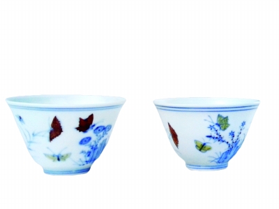 展品中,最引人注目的莫過于成化斗彩三秋杯了。記者看到,這對不足4厘米高的三秋杯,胎體薄如蟬翼,從杯子內壁可看透外壁花紋。胎體上描繪了兩只在山石花草中翩躚飛舞的蝴蝶。專家說,其中一只蝴蝶的翅膀上所施的紫色彩釉色濃而無光,是明代成化斗彩的固有特征,也是后世仿品無法效仿之處。由于杯上描繪的是秋天的景色,而歷時三月的秋季又有“三秋”之稱,因此被賦予“三秋杯”的雅稱。