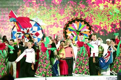由美國猶他州立猶他山谷大學(xué)國標舞團表演的《美國西部土風(fēng)舞》個性張揚奔放,青春靚麗的美國大學(xué)生,以歡快的步伐,時而跳起“牛仔”,時而扭起“拉丁”,上演著一場美國西部鄉(xiāng)村舞會。埃及轉(zhuǎn)裙舞,則全部由男人表演,舞者以左腳為圓心,呈逆時針方向不停地旋轉(zhuǎn),舞者好似靜心冥思。隨后,洋溢著濃郁俄羅斯風(fēng)情的歌曲《歡樂的早晨》、彰顯埃塞俄比亞人民熱情和勇敢個性的舞蹈《我的祖國》……一個又一個極具藝術(shù)性的節(jié)目相繼登臺,把整個展演推向高潮。