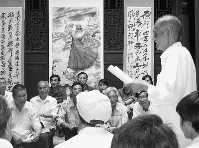 屈原故里端午文化節(jié)詩會上,農(nóng)民詩人李國杰(右立者)吟唱古體詩。呂艷攝