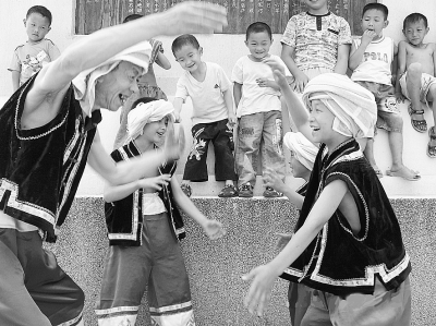 土家族“撒葉兒嗬”國家級傳承人張言科在教小學生跳“撒葉兒嗬”。宜昌長陽縣民族民間傳統(tǒng)文化保護中心提供
