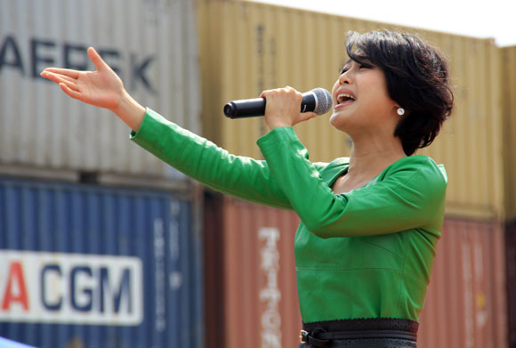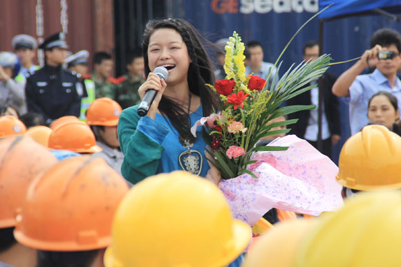 10月18日至19日,“送歡樂下基層”中國文聯文藝志愿服務團赴廣西防城港慰問演出。19日上午,藝術家在港務集團集裝箱碼頭為工人表演。圖為寧可演唱歌曲。中國文藝網 何瑞涓 拍攝