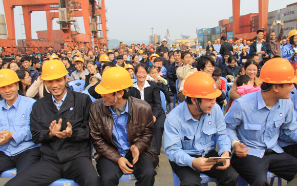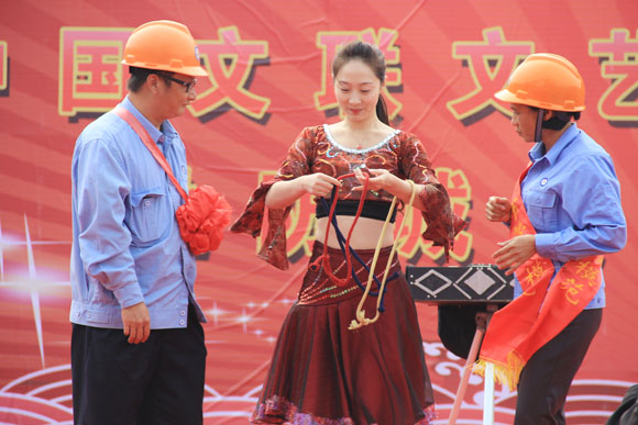 10月18日至19日,“送歡樂下基層”中國文聯文藝志愿服務團赴廣西防城港慰問演出。19日上午,藝術家在港務集團集裝箱碼頭為工人表演。圖為表演現場。中國文藝網 何瑞涓 拍攝