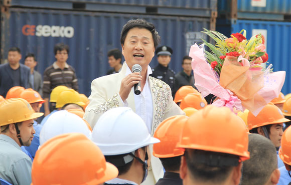10月18日至19日,“送歡樂下基層”中國文聯文藝志愿服務團赴廣西防城港慰問演出。19日上午,藝術家在港務集團集裝箱碼頭為工人表演。圖為孫維良演唱歌曲。中國文藝網 何瑞涓 拍攝