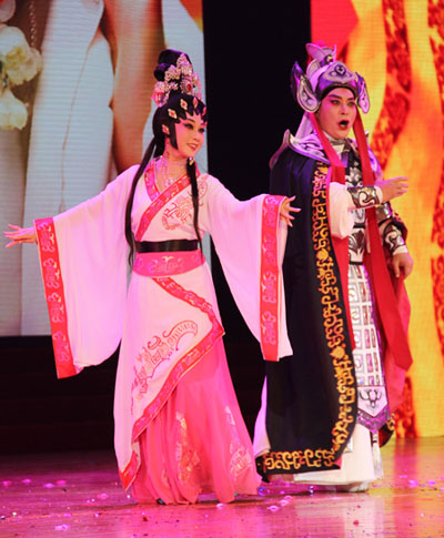10月18日至19日,“送歡樂下基層”中國文聯文藝志愿服務團赴廣西防城港慰問演出。18日晚,藝術家在市文化藝術中心為觀眾傾情演出。圖為歐凱明、崔玉梅演唱粵劇。中國文藝網 何瑞涓 拍攝