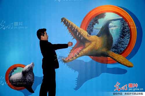 11月11日,2013中國3D魔幻藝術巡展在甘肅省蘭州市張掖路紫金百貨舉行。50幅不同主題風格的3D藝術畫吸引著現場觀眾感受3D營造的立體空間,來參觀的市民在這些畫展面前紛紛擺出自己的創意造型拍照留念。本次巡展將持續到2014年3月31日。白為舟攝 光明圖片