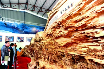 11月14日,參觀者在欣賞大型木雕《清明上河圖》。 當日,大型木雕《清明上河圖》在吉尼斯世界紀錄總部認證官的見證下,成功地創造了吉尼斯世界紀錄,成為世界上最長的木雕。刻在整根樟樹木兩面的大型木雕《清明上河圖》長12.286米、寬2.401米、高3.075米,重約30噸,是福建省工藝美術大師鄭春輝歷時近4年完成的。 新華社記者 林善傳攝