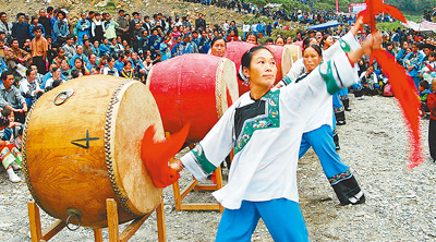 9日下午,在被譽為“天下鼓鄉”的湘西德夯,2013吉首國際鼓文化節“鼓王爭霸賽”激戰正酣。德夯景區代表隊選手楊欣,跟著邊鼓的節奏,在一面猩紅的苗鼓前,跳躍、旋轉、擊打,鼓聲時而輕快清脆,時而高亢激昂,聲聲鼓韻,傳遞出苗家人的喜怒哀樂。