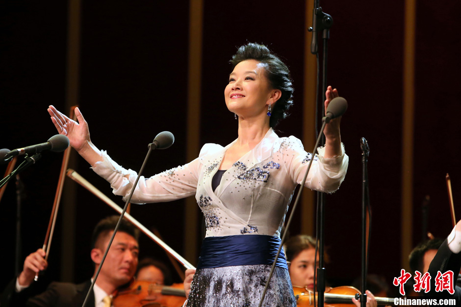 12月25日,宋祖英演唱歌曲。當晚,《人民的毛澤東》紀念毛澤東誕辰120周年音樂會在國家大劇院舉行,上千名首都各界群眾共同觀看了這臺音樂會。中新社發 李慧思 攝