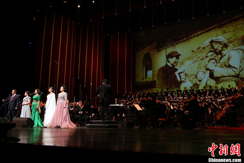 12月25日,身著紅軍服裝的歌唱演員演唱歌曲《紅軍想念毛澤東》。當晚,《人民的毛澤東》紀念毛澤東誕辰120周年音樂會在國家大劇院舉行,上千名首都各界群眾共同觀看了這臺音樂會。中新社發 李慧思 攝