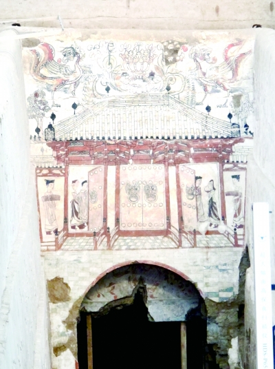 據(jù)介紹,現(xiàn)存的200余平方米壁畫主要集中在墓道的東、西、北三壁及墓室頂部。其中,墓道北壁繪的規(guī)模宏大的木結(jié)構(gòu)廡殿頂建筑是我國首次發(fā)現(xiàn)的雙柱式結(jié)構(gòu)古建筑圖樣。該木結(jié)構(gòu)建筑面寬5間,中間的大門上固定有32顆圓形門釘,大門中央設(shè)有門環(huán),門環(huán)底部裝飾有獅形猛獸,瞪著雙目,露齒銜環(huán)。在屋頂?shù)恼戏嚼L一火盆,左右兩側(cè)各繪一獸首鳥身的怪獸形象,屋檐下還有6個(gè)侍女側(cè)立。中國社會(huì)科學(xué)院考古研究所教授楊泓介紹說,這幅壁畫是目前為止發(fā)現(xiàn)最早的斗拱結(jié)構(gòu)古建筑資料,比建筑學(xué)家梁思成在五臺山發(fā)現(xiàn)的唐代佛光寺東大殿斜拱構(gòu)造建筑早了100多年。
