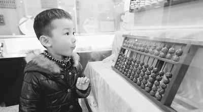 浙江省臨海市國華珠算博物館內(nèi),一個小男孩正在端詳一款桃木算盤。人民圖片