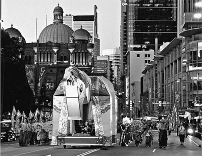 澳大利亞悉尼巡游表演中,具有中國特色的巨型駿馬花燈與遠處的維多利亞女王大廈相映成趣。本報記者 韓 超攝