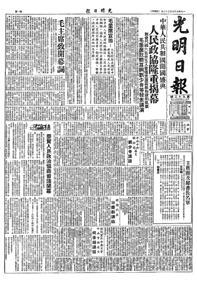 1949年9月21日,中國人民政治協商會議第一屆全體會議舉行。這是第二天出版的光明日報。 資料圖片