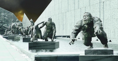 這組組雕的背景是以三角形體面為元素的主體建筑為背景,組成激越而低沉,悲慘而激憤的樂章。就空間而言,它形成氣場,使觀眾統懾于悲天憫人的氛圍中。在進入紀念館前已受到凈化。讓觀眾進入紀念館后,每見一根白骨,每見一件血衣產生無限的悲情和聯想。