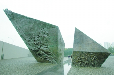 建筑師為紀念館設計的主建筑由東至西,最高處18米,最低處西端為正負零。我設計的《冤魂吶喊》在西端,從構思上步入情緒高潮,從整體視覺形式上呼應了建筑,也為建筑的西端增加了應有的平衡。它以劈開的山形寓意破碎的祖國河山,其豁口便自然成了紀念館的門道。它虛擬城門,是逃難之門,是死亡之門。左側三角形直指蒼穹,塑造了一吶喊的冤魂。右側表現的是平民生靈被屠戮的場面。它拔地而起,斜插云霄;是冤屈的吼聲,是正義的呼號。以三角形的視覺沖擊,緊連大地攝人魂魄,撼人心魂。
