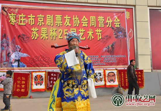 3月9日,星期天,乍暖還寒,上午九點鐘,山東省棗莊市周營鎮駐地,京腔陣陣、絲弦悠悠,由周營鎮政府和“周營京劇票友協會”主辦的“第25屆藝術節”正在舉行。當日,來自周營鎮京劇票友協會和棗莊市京劇票友協會的50余京劇愛好者們紛紛登臺獻藝,為全鎮的民演出了《蕭何月下追韓信》、《白毛女》、《沙家浜選段智斗》等30多個經典京劇劇目,贏得了村民們的陣陣掌聲與喝彩,讓村民們在家門口過了一把京劇癮。