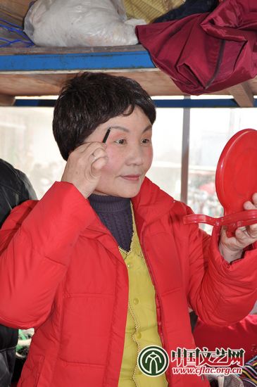 在舞臺旁邊一個狹窄的售貨亭里,60多歲的朱瑞雪女士正在仔仔細細地化妝。從40多歲開始業余學唱京劇,如今已唱了15年了。等在一旁專門為她伴琴師也已滿頭白發。