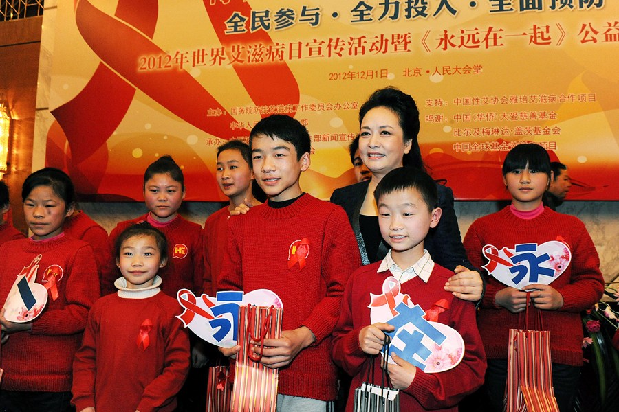 2012年12月1日,世界衛生組織艾滋病防治親善大使、衛生部預防艾滋病宣傳員彭麗媛與參與公益短片《永遠在一起》的青少年一起參加世界艾滋病日宣傳活動。該片倡導社會各界共同關心和幫助受艾滋病影響的兒童,呼吁更多人關愛、不歧視艾滋病病毒感染者和病人,為抗擊艾滋病作出貢獻。當日,“全民參與 全力投入 全面預防2012年世界艾滋病日宣傳活動”在北京舉行。新華社記者何俊昌攝