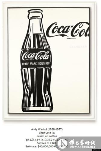 安迪·沃霍爾手繪的這幅高約6英尺的“可口可樂(3)”創作于1962年,與其后期創作的絲網版畫風格不同。佳士得戰后及當代藝術部國際區總裁Brett Gorvy表示:“如果你想要定義波普藝術,看這幅畫就夠了,因為它含有兩個最具代表性的元素:可口可樂和安迪·沃霍爾。”