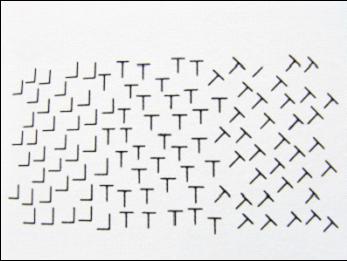 圖4.顯示了一堆L形與T形。我們的眼睛會把這些形狀分成左、中、右各三堆形狀,這種依形狀的相似度來分類的規律,稱之為相似律。