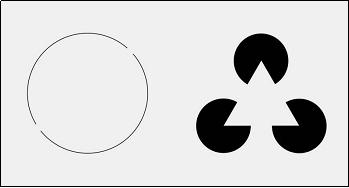 圖7.左邊顯示的是一個圓,有兩個斷口。我們眼睛不會把這個圖形當成兩個半圓,而直接會把它看成一個封閉的圓;這叫封閉律。圖7.右邊大家都會看到一個三角形;而其實三角形根本不存在。這是由于封閉律的作用,所以人人都「看」到了這個不存在的三角形。