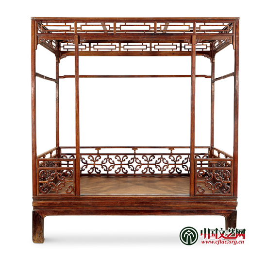 注解:黃花梨制成的架子床是貴重的明式家具,制作工期可能逾年,在幾個世紀以前,擁有一張黃花梨架子床是財富和地位的象征。架子床除實用外,還被賦予了很多內容,此床就有世代繁榮、事事如意等美好寓意,是中國床文化所特有的。明式架子床可分為四柱、六柱兩種類型。六柱架子床除了床座四角柱,還增添了正面兩根支柱,以及與其連接一般為方形的門圍子。床圍子的裝飾,又分為用短材攢接而成的幾何圖紋,或主要用鎪鏤的小塊花片構成圖案,稱斗簇造。傳世品中以鎪鏤螭龍紋較多,攢接造幾何紋如現例就較稀少。