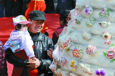云丘山花饃歷史悠久,按功能可分為節慶習俗饃、人生禮儀饃和日常食用饃三大類,其造型有花鳥、瓜果、飛禽走獸等數百個品種。圖為游人在太原市迎澤公園欣賞云丘山巨型花饃。