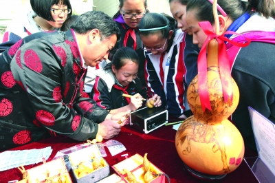 4月17日,北京市東直門中學舉辦首屆“傳統文化校園日”活動,校方請來的北京民間技藝師傅向學生們展示了雕漆、料器、泥塑、糖畫等的制作技藝。圖為民間技藝師傅在指導中學生制作葫蘆烙畫。