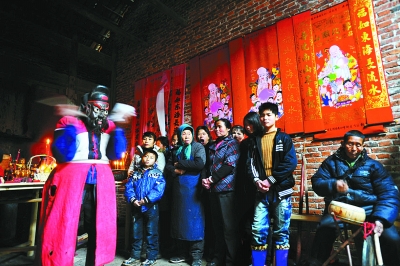 中村儺戲雖沒有行當(dāng)之分,卻有男女之別,比如《抱冬易》是每年春節(jié)期間最為精彩的節(jié)目,面具后的郭顯椿,左手抱著木偶,右手揮舞著紅布,扭著不同身段,去演繹女性角色。此時,手牽白線的村婦站在人群中,翹首等待掛線的機會。村婦們手里扯著象征著12個月的12根線,線頭上扎著一個裝有錢幣的紅包。當(dāng)帶面具的“女子”抱著木偶旋轉(zhuǎn)數(shù)圈后,婦女們便爭相將手里的線掛到木偶身上,以祈求家人長命百歲。