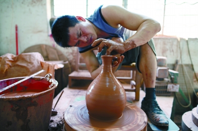 工作人員在手工制作坭興陶本報記者 陳 曦 攝