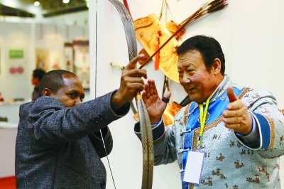 弓箭技藝傳承人向外國游客展示技藝。 陳 曦 攝