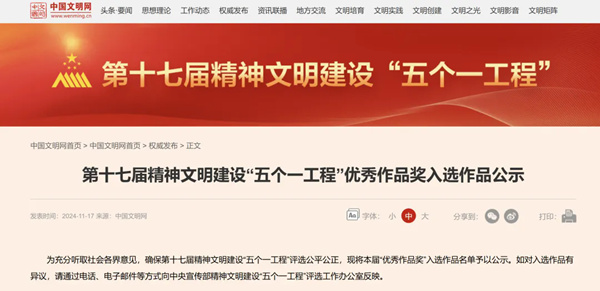 11月18日,中央宣傳部精神文明建設(shè)“五個(gè)一工程”評選工作辦公室印發(fā)《第十七屆精神文明建設(shè)“五個(gè)一工程”優(yōu)秀作品獎入選作品公示》的通知,公示了本屆“優(yōu)秀作品獎”入選作品名單。