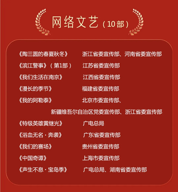 此次入圍的“五個(gè)一工程”評選的10部優(yōu)秀網(wǎng)絡(luò)文藝作品中,包括《陶三圓的春夏秋冬》《濱江警事》(第1部)《我們生活在南京》3部網(wǎng)絡(luò)文學(xué)作品,《漫長的季節(jié)》《我的阿勒泰》2部網(wǎng)絡(luò)劇,《特級英雄黃繼光》《浴血無名·奔襲》2部網(wǎng)絡(luò)電影,以及系列紀(jì)錄片《我們的賽場》、網(wǎng)絡(luò)動畫片《中國奇譚》和網(wǎng)絡(luò)綜藝節(jié)目《聲生不息·寶島季》等。