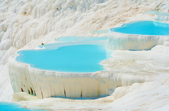 自遠古時期,棉花堡就有這樣的情景:藍綠色的水流進白如棉花的階梯形的石灰華(一種多孔碳酸鈣)水池,碳酸鈣的沉淀物使得這些溫水池熠熠生輝。