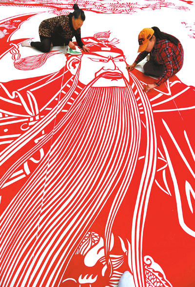 10月19日,山西省河津民間剪紙藝人高曉東的家人在修正巨幅剪紙作品《中華二圣圖》。高曉東用時15個月創作了巨幅剪紙作品《中華二圣圖》。這幅作品長26.30米,高17.36米,以中華“文武二圣”孔子和關公為人物主體,經十余道工序剪制而成。 新華社發 薛俊 攝