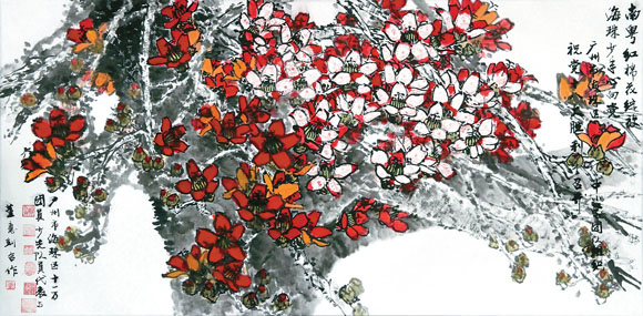 近日,廣州市海珠區一百多所中小學的團員、少先隊員代表,與畫家董應釗一起,共同創作了“南粵紅棉花綻放,海珠少年心向黨”畫卷,向黨的十八大獻上羊城少年的心意。據了解,在該畫卷中,紅棉樹上的花朵是由中小學團組織和隊組織的印章拓印而成。中國藝術報記者 孟祥寧 攝