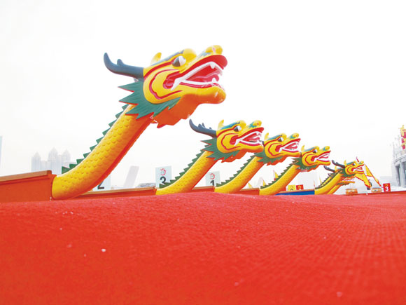 2013中國(guó)龍舟公開賽28日在吉林省吉林市開賽。圖為在吉林松花江邊拍攝的比賽用龍舟。