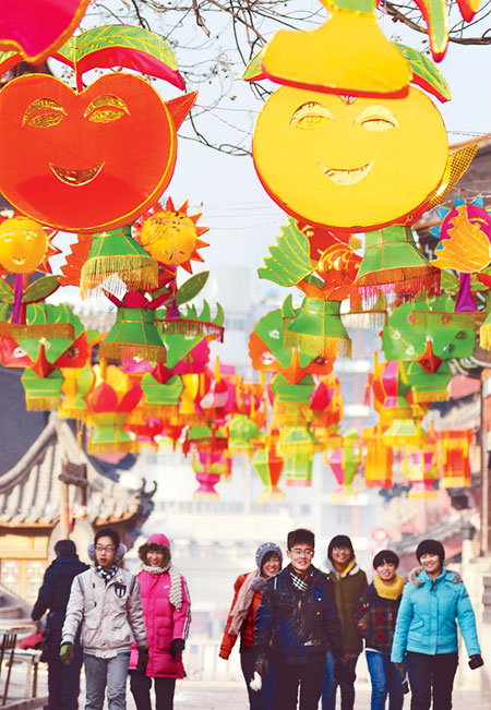 1月12日,游客在山東周村古城賞花燈。當日是臘月初一,以“古城流韻迎新春”為主題的山東淄博市周村古城的2000余盞花燈把古香古色的街道裝扮得五彩繽紛。
