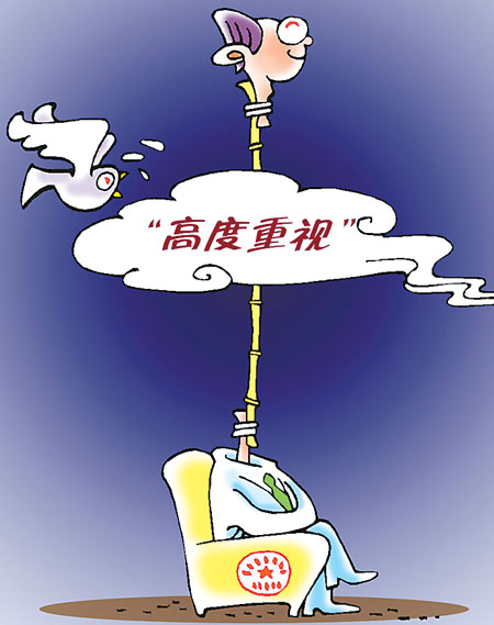 《人民日報》近日在讀者來信版向網友征集“你最反感的官話套話”,“高度重視”成了頭號選項。的確,許多個“高度重視”,只是徒有“高度”,卻往往并不緊密貼合百姓意愿的實際;口稱“重視”,偏偏只聞雷聲不見雨點。這類“官話宣言”、“套話做秀”,其實對社會的實質進步毫無價值。有道是:官話套話太常見,“高度重視”成笑談;只盼公仆干實事,樂為百姓多解難。