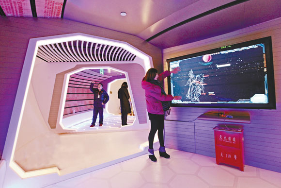 近日,上海東方明珠塔的最高球體“太空艙”經過全新改造開門迎客。東方明珠塔高468米,“太空艙”位于350米,是最高觀光層。此次創新改造通過未來主義風格的空間設計來演繹太空概念,展示太空場景的科幻魅力以及我國正在開展的太空探索項目。圖為游客在“太空艙”體驗“星月墻”。
