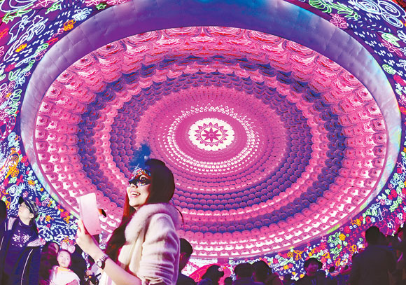 2月3日,第十九屆自貢國際恐龍燈會在四川省自貢市彩燈公園正式亮燈開園。此次燈會運用高科技、新光源,打造出具有超強視覺震撼、夢幻藝術(shù)效果的“吉祥中國年”、“夢幻天穹”、“侏羅紀探秘”、“鹽都印象”、“中華彩燈”和“開心城堡”六大主景區(qū),構(gòu)成創(chuàng)新制作的80余組各類大中型彩燈精品。圖為在四川省自貢市彩燈公園里,一名女孩欣賞《夢幻天穹》燈組。