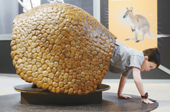 近日,在美國佐治亞州亞特蘭大弗恩班克自然歷史博物館舉行的“遠古哺乳動物展”中,7歲的戴維斯從一只雕齒獸(現代犰狳近親)的甲殼模型中爬出來。展覽將持續到8月18日。